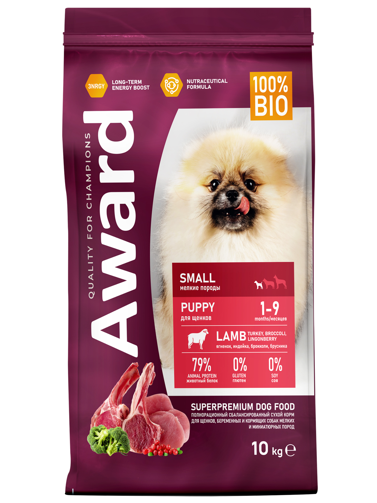 Сухой корм AWARD для щенков от 1 мес, беременных и кормящих сук мелких и мин. пород с ягненком и индейкой с добавлением брокколи и брусники 10 кг