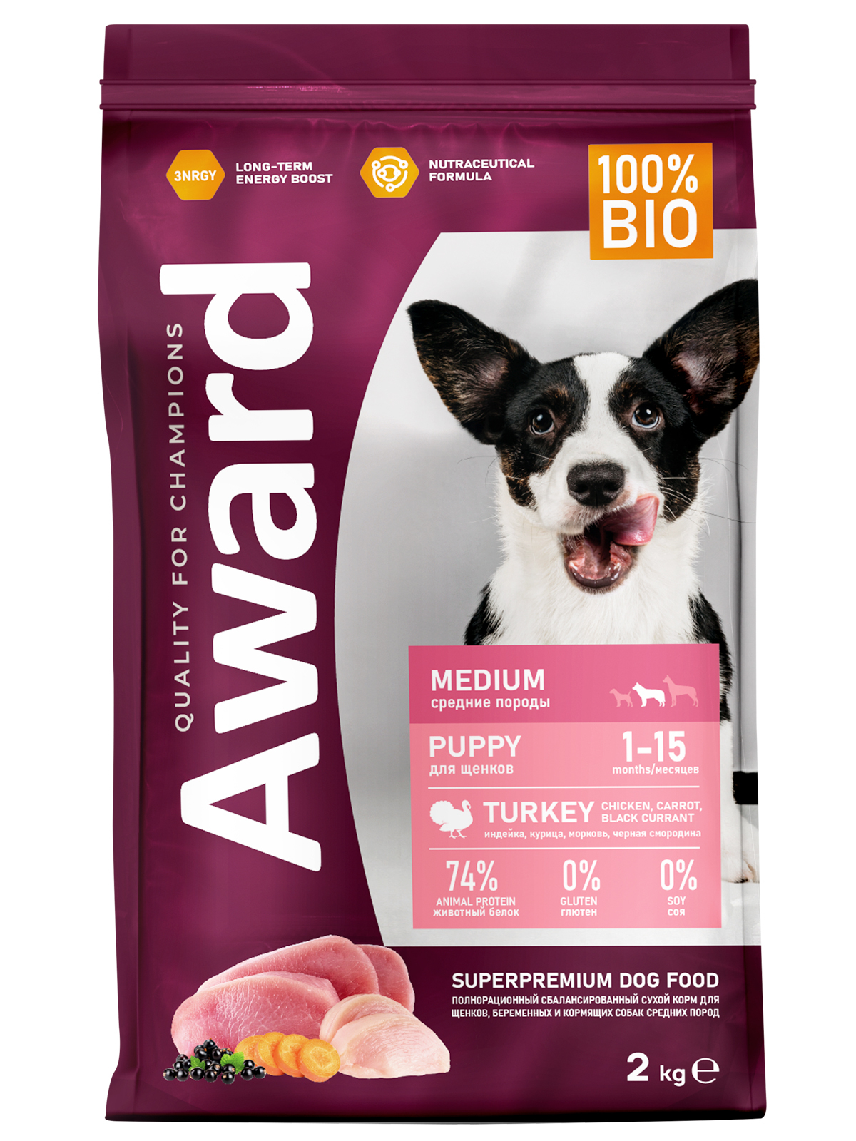 Сухой корм AWARD для щенков от 1 мес, беременных и кормящих сук средних пород с индейкой и курицей с добавлением моркови и черной смородины 2кг