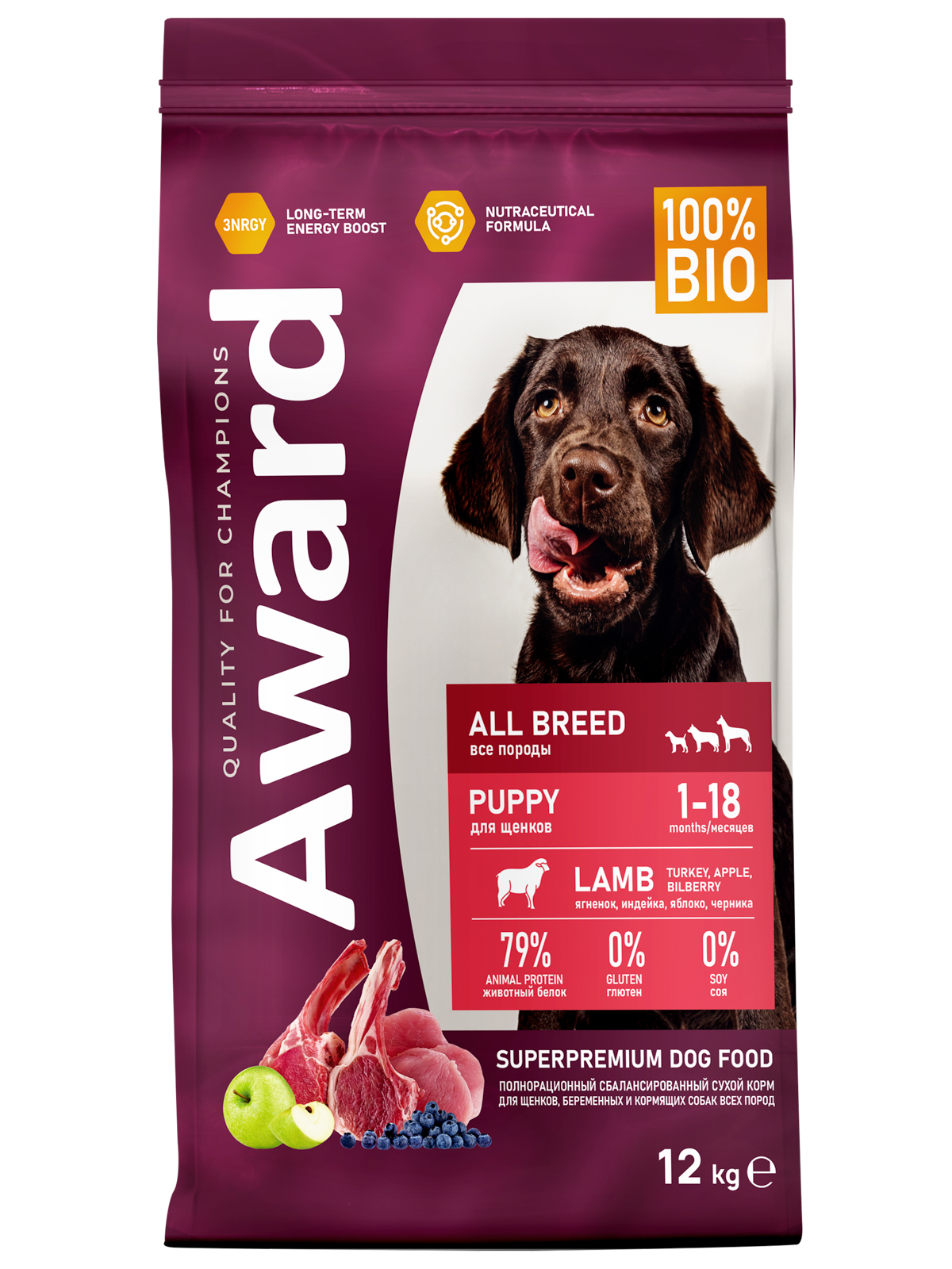 Сухой корм AWARD для щенков от 1 месяца, беременных и кормящих сук всех пород с ягненком и индейкой с добавлением яблока и черники 12 кг