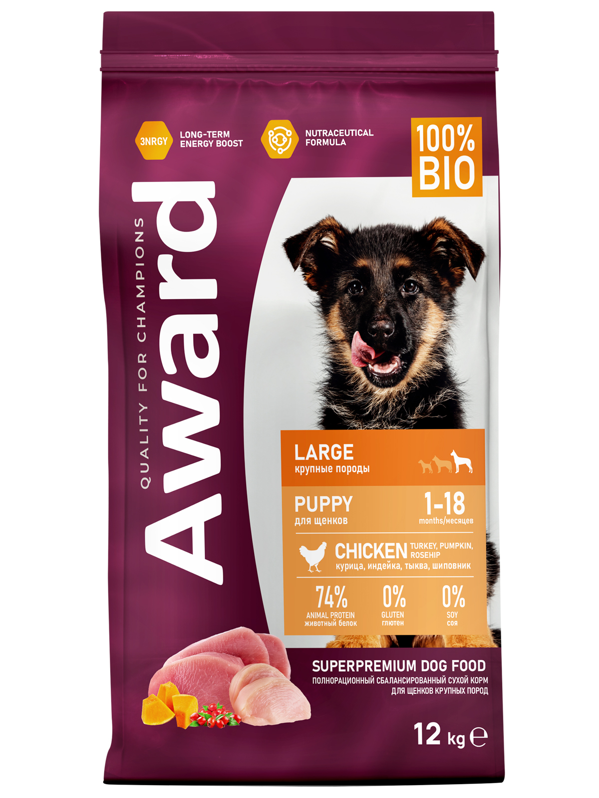 Сухой корм AWARD для щенков от 1 месяца крупных пород с курицей и индейкой с добавлением тыквы и шиповника 12кг