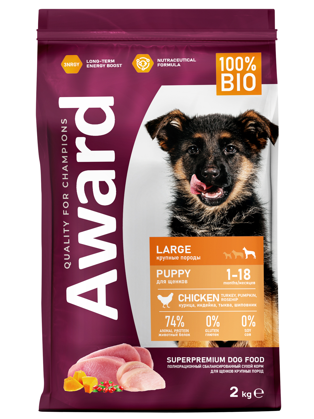 Сухой корм AWARD для щенков от 1 месяца крупных пород с курицей и индейкой с добавлением тыквы и шиповника 2кг