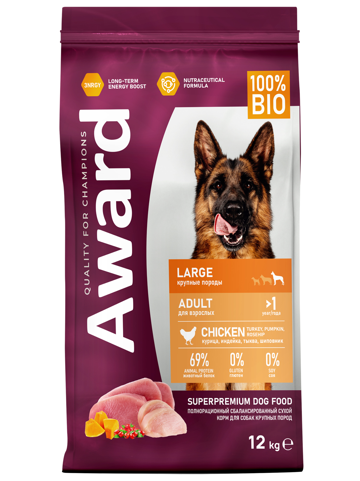 Сухой корм AWARD для взрослых собак крупных пород с курицей и индейкой с добавлением тыквы и шиповника 12 кг