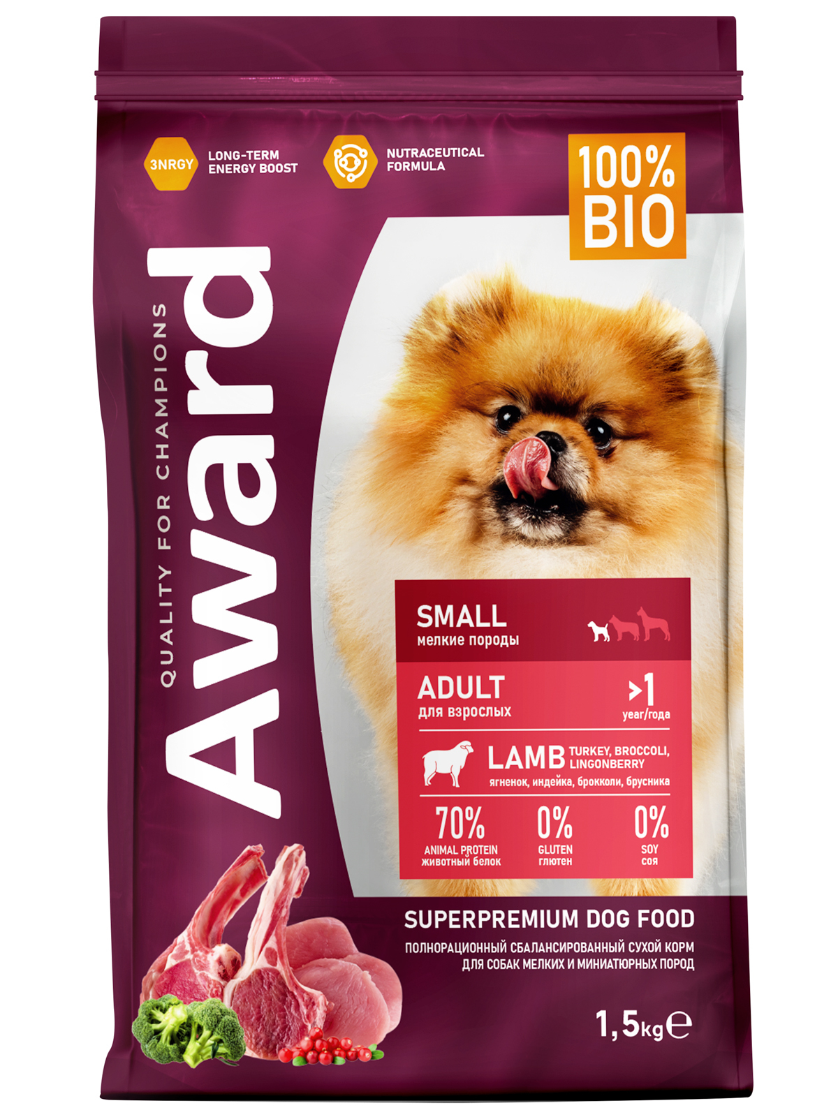 Сухой корм AWARD для взрослых собак мелких и миниатюрных пород с ягненком и индейкой с добавлением брокколи и брусники 1,5кг