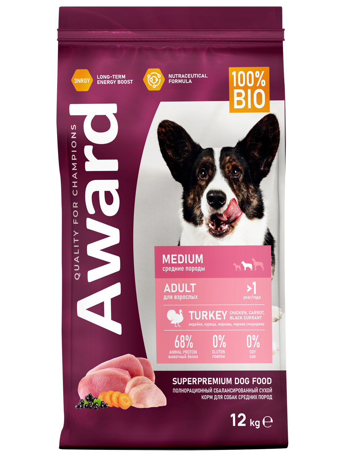 Сухой корм AWARD для взрослых собак средних пород с индейкой и курицей с добавлением моркови и черной смородины 12кг