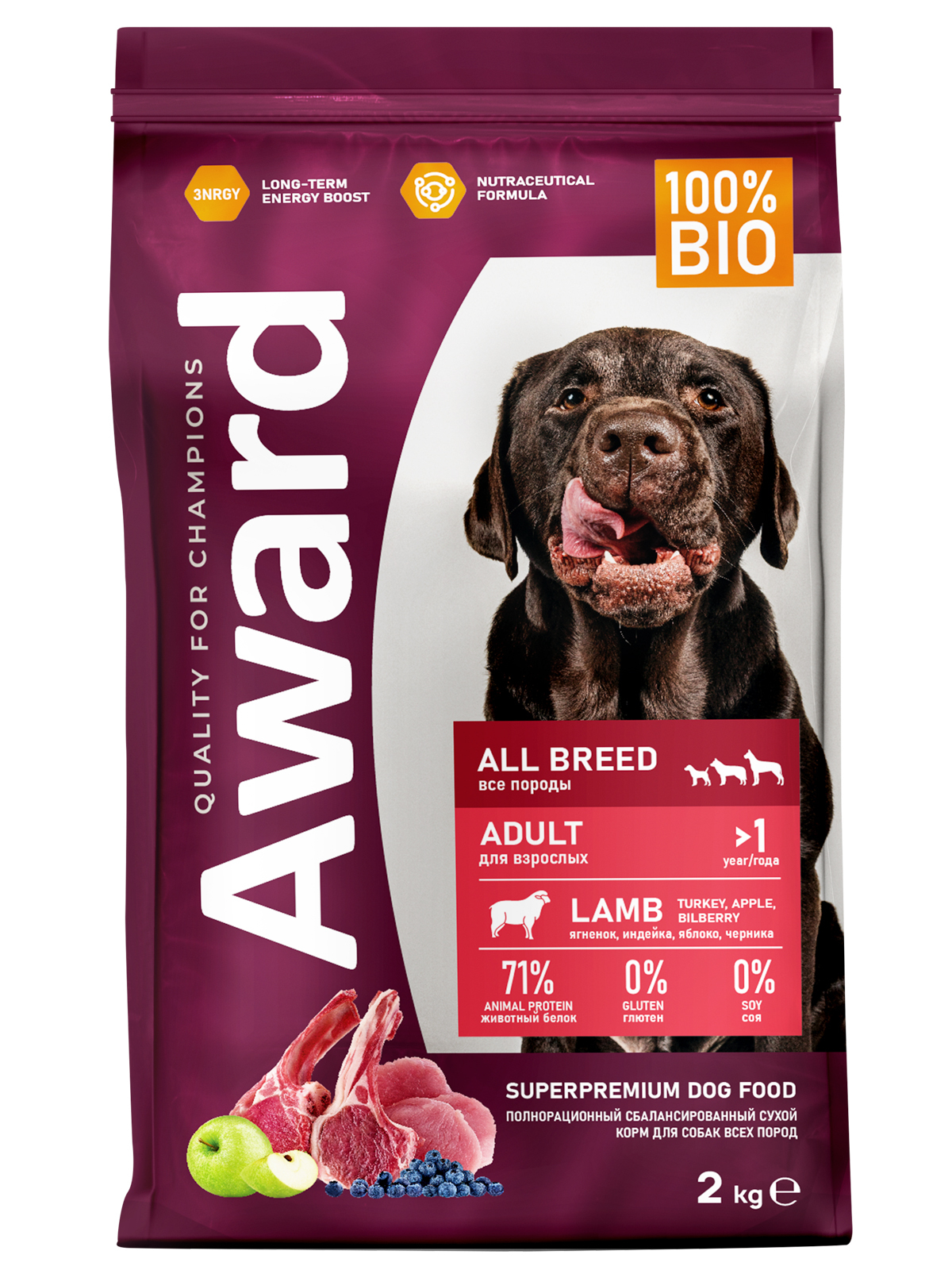 Сухой корм AWARD для взрослых собак всех пород с ягненком с индейкой с добавлением яблока и черники 2кг