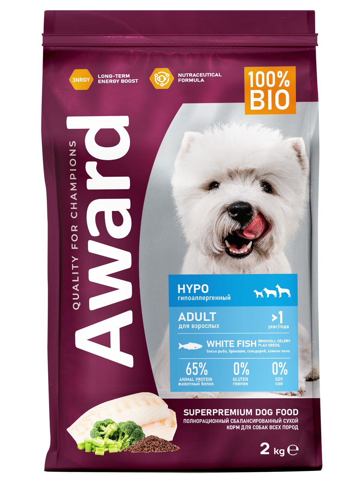 Сухой корм AWARD HYPO для взрослых собак всех пород с белой рыбой с добавлением брокколи, сельдерея и семян льна 2кг