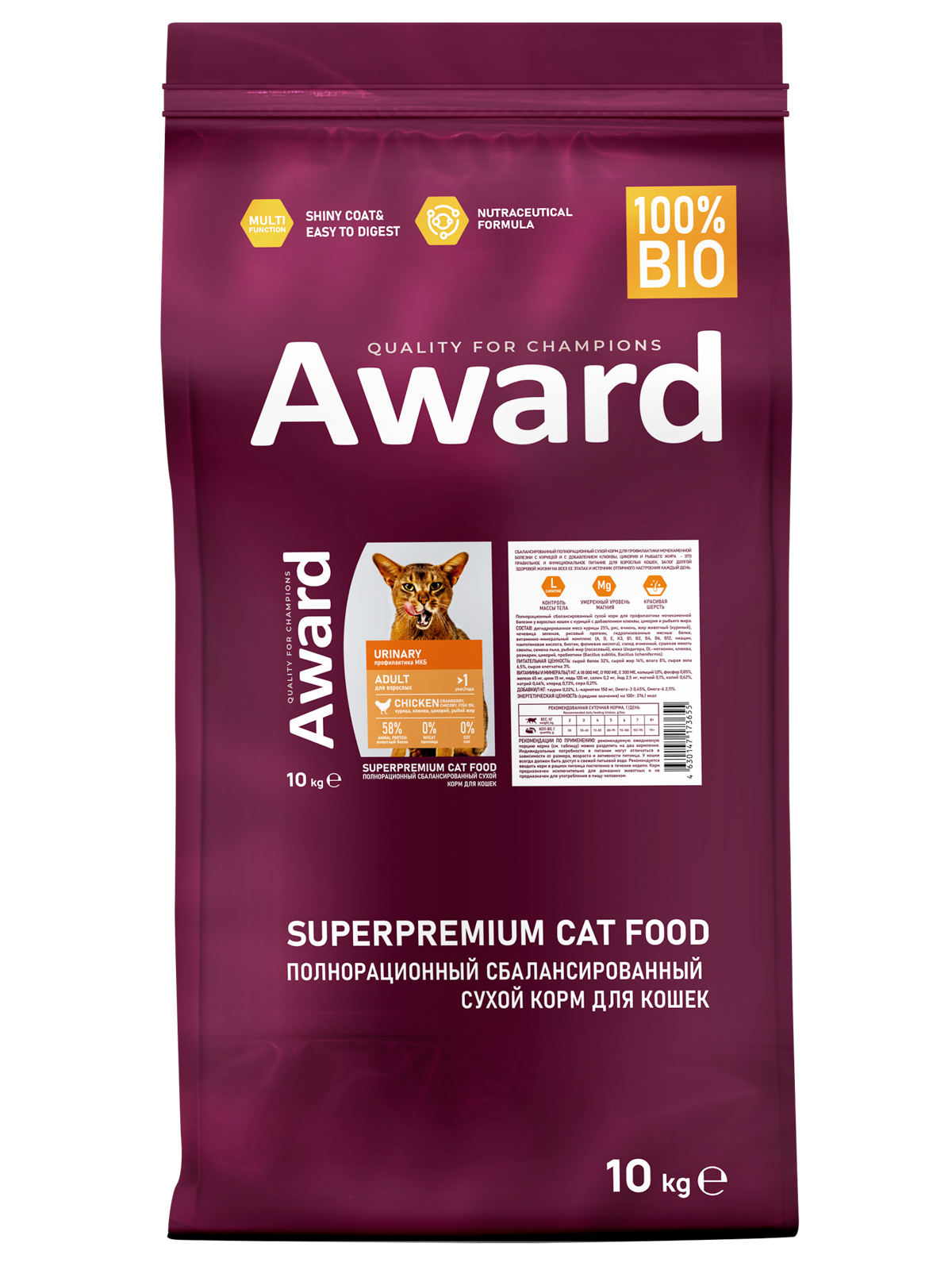 Сухой корм AWARD Urinary для взрослых кошек для профилактики мочекаменной болезни с курицей с добавлением клюквы, цикория и рыбьего жира 10кг