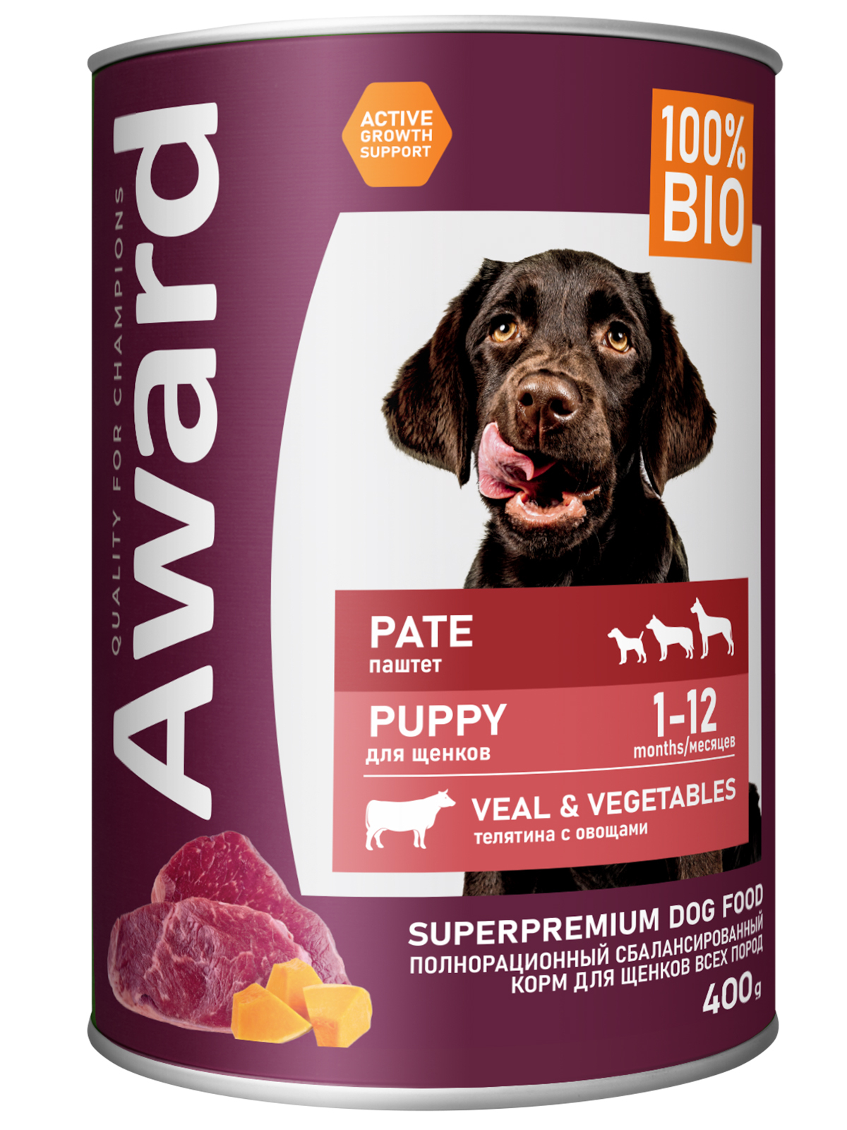Влажный корм AWARD для щенков от 1 месяца паштет из телятины с овощами 400г