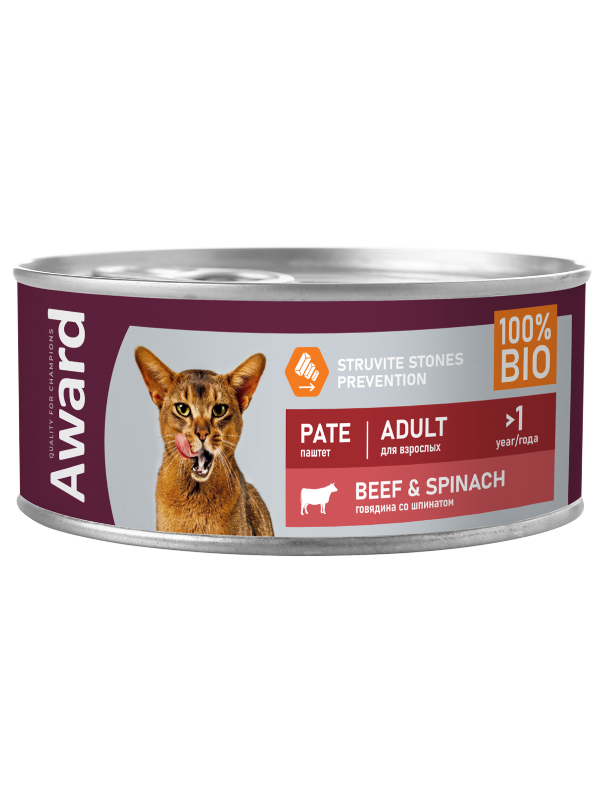 Влажный корм AWARD для взрослых кошек паштет из говядины со шпинатом 100г