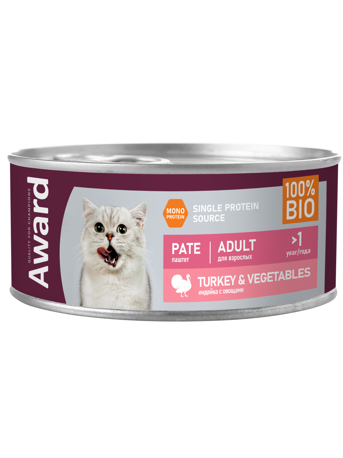 Влажный корм AWARD для взрослых кошек паштет из индейки с овощами 100г.