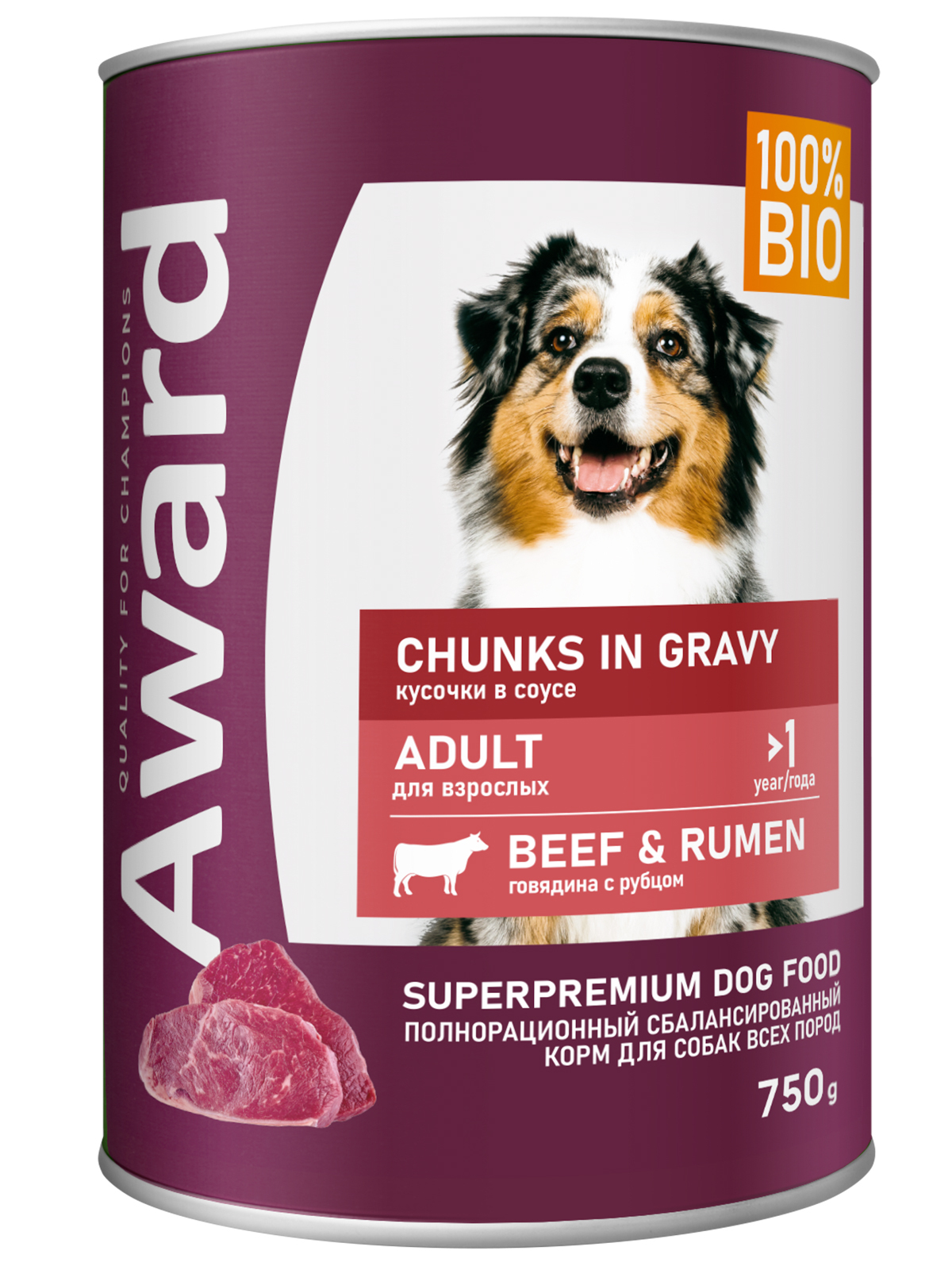 Влажный корм AWARD для взрослых собак кусочки с говядиной и рубцом в соусе 750г