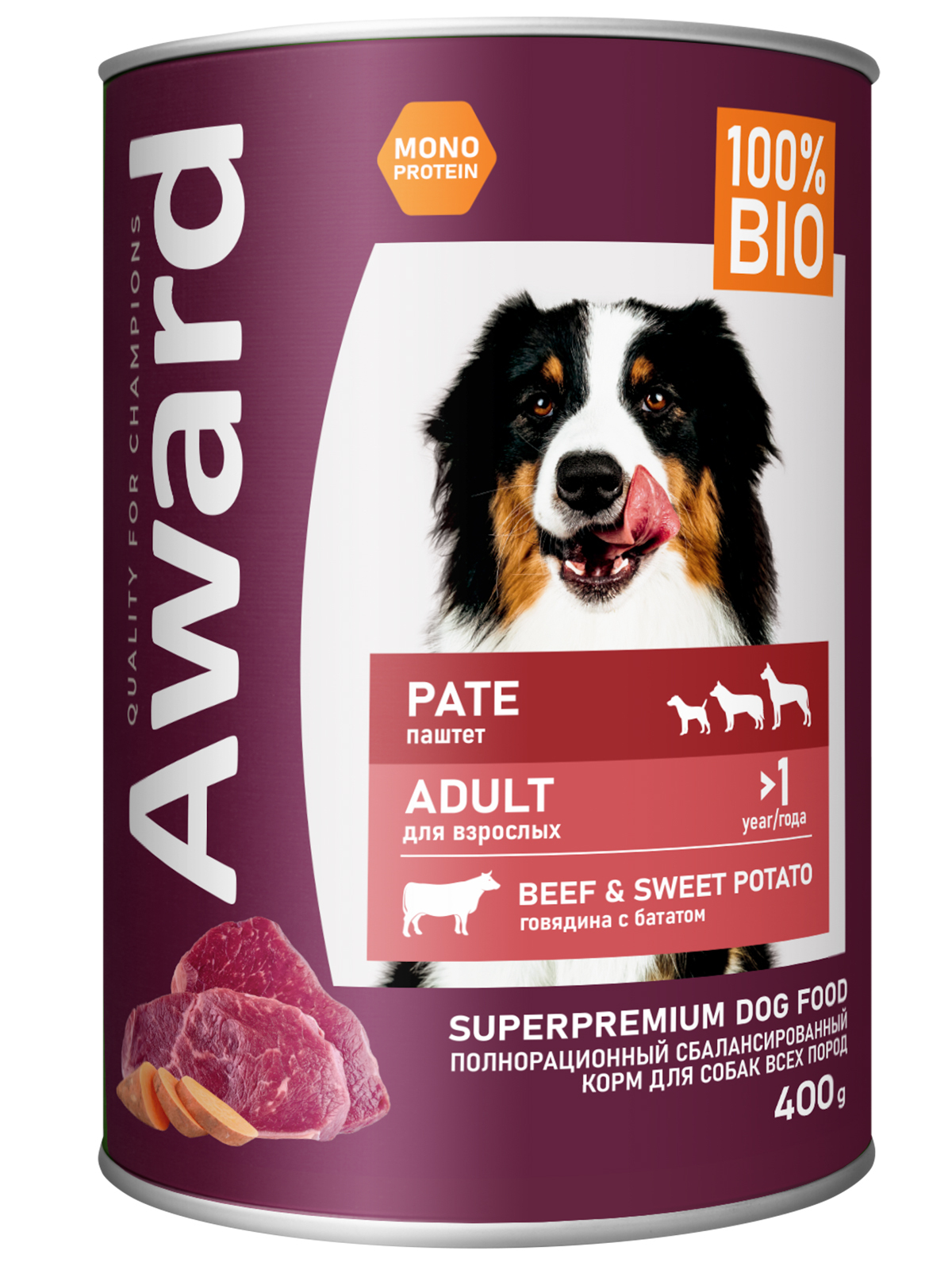 Влажный корм AWARD для взрослых собак паштет из говядины с бататом 400г