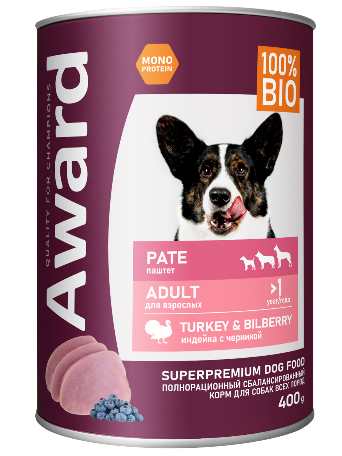 Влажный корм AWARD для взрослых собак паштет из индейки с черникой 400г