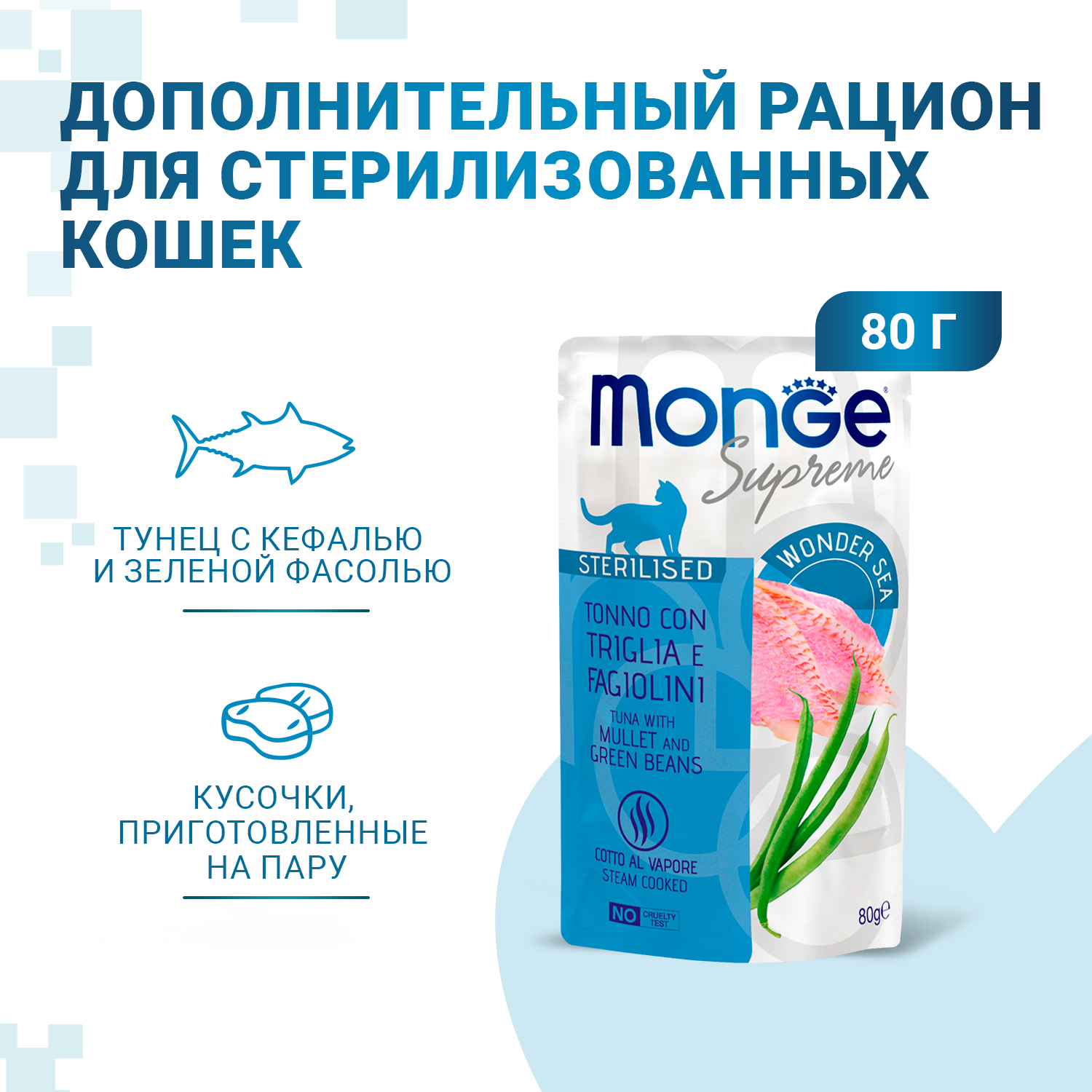 Влажный корм Monge Supreme sterilized cat для стерилизованных кошек с кефалью и зелёной фасолью, паучи 80 г